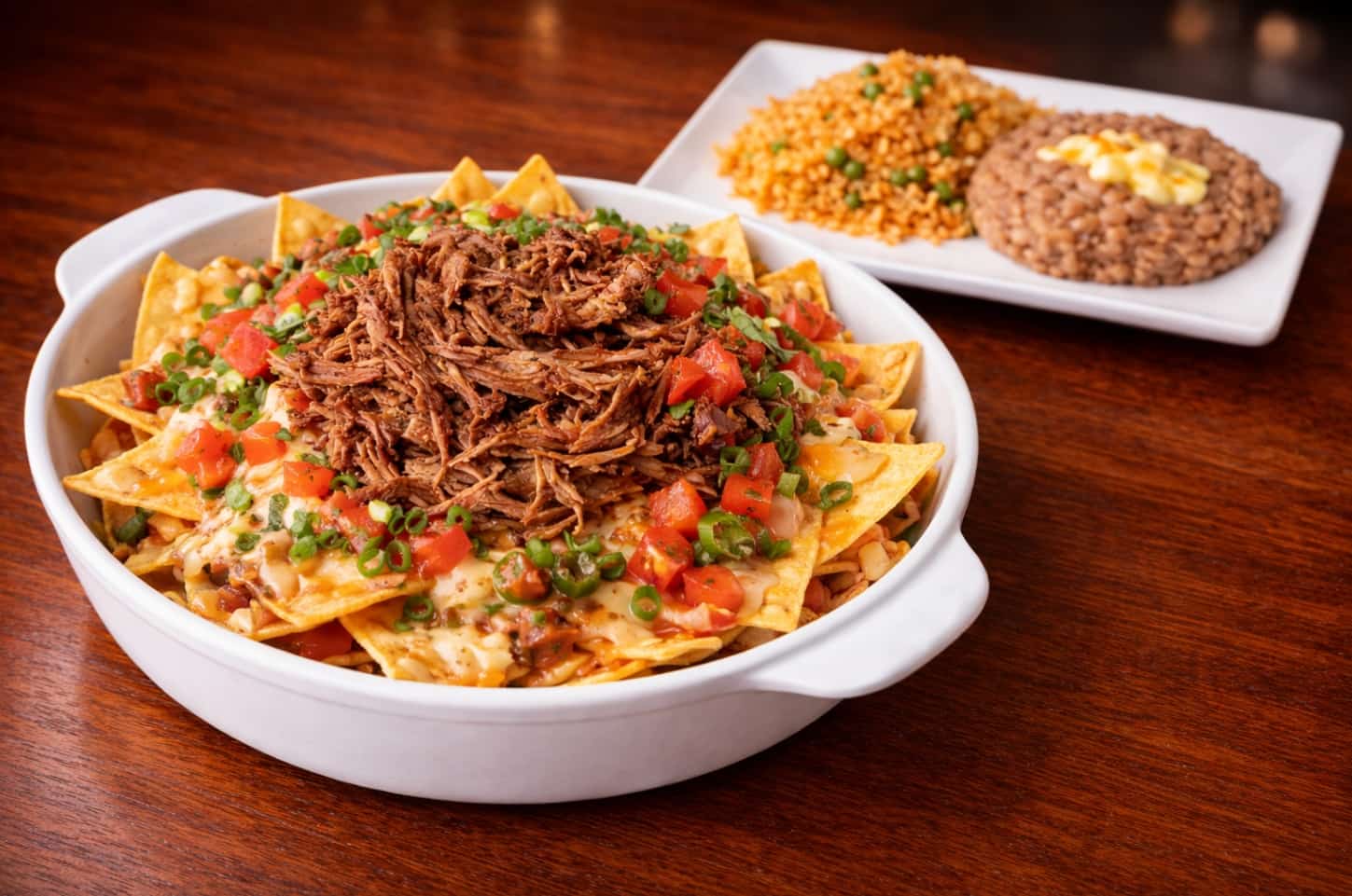 It is a dish traditionally made from deep-fried corn tortilla chips covered with typical toppings like meat (usually ground beef), cheese, refried beans (pinto beans), sour cream, and salsa.